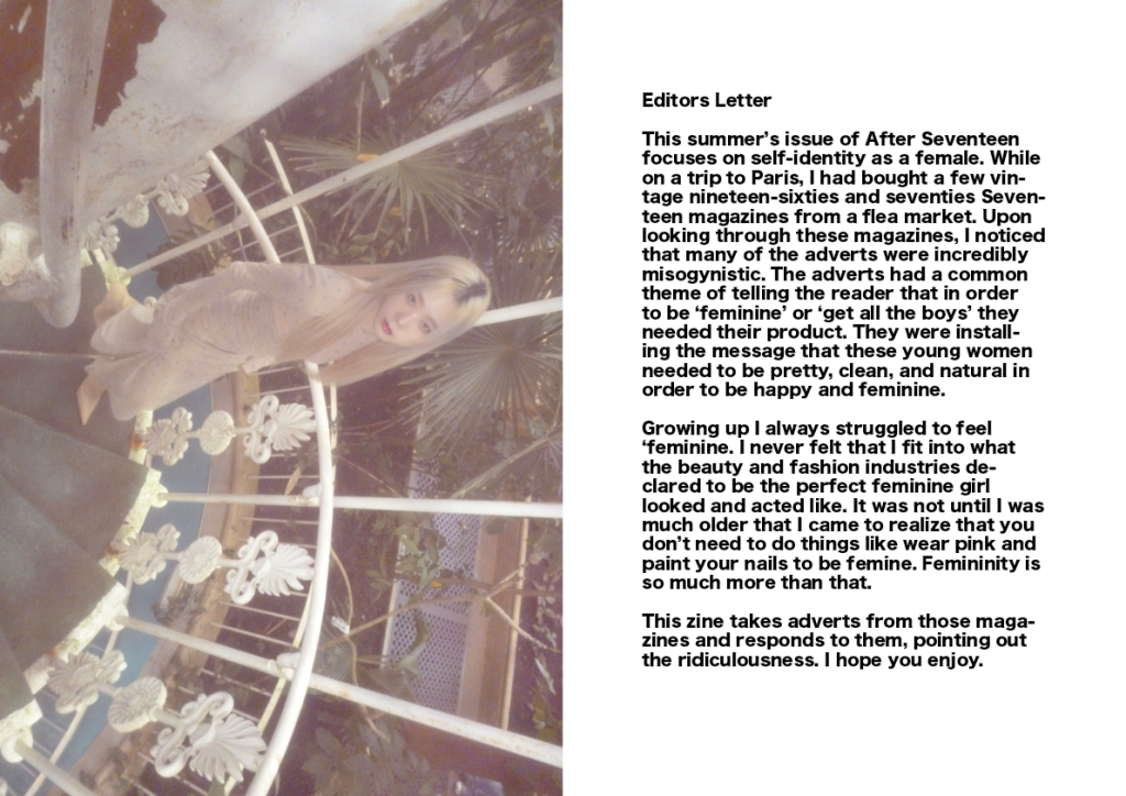 For my zine I want to focus on self-identity as a female. While I was in Paris I went to a flea market and bought two Seventeen magazines, one from the nineteen-sixties and one from the seventies. Upon looking through these magazines I noticed that many of the adverts were very sexist. Some adverts had a common theme of telling the reader that in order to be ‘feminine’ they needed their product, almost all the perfume ads had a message that said their perfume would make a man fall in love with you, while also including advertisements for weight loss camps. In my zine I wanted to focus on how femininity is not about looking pretty and smelling good, and how everyone has their one version of femininity.